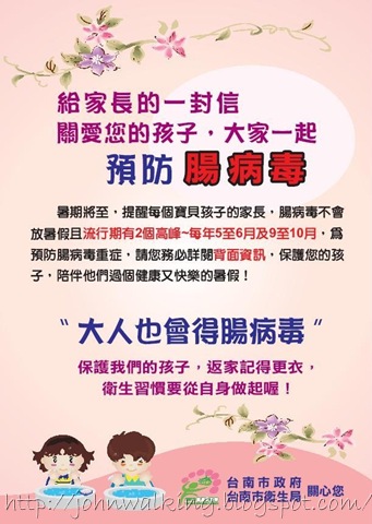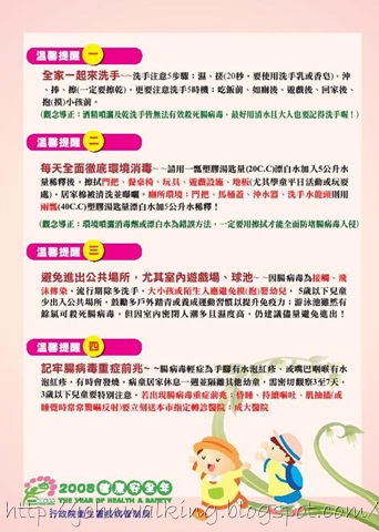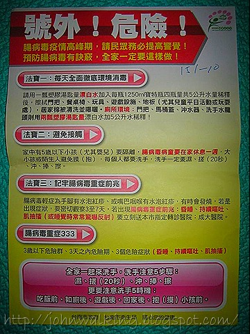 前幾天,社區警衛拿給我們家這張宣傳單,要我們多加注意,加強防範腸病毒,頓時發現其嚴重性;馬上張貼起來,提醒自己、老公、家人隨時注意家居清潔與消毒,回家後馬上洗手、更衣。