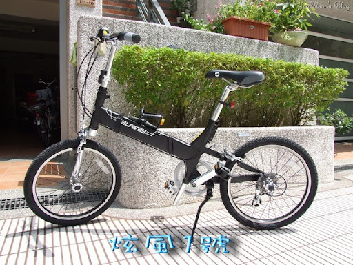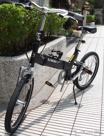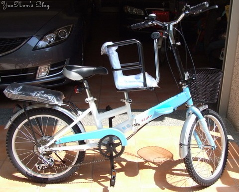 呵呵呵,以上是我老公的小折─『炫風』成為家族成員的經過,我的小折─『小藍』也是因緣際會買到的,我一直在「麵包機」跟「親子腳踏車」中猶疑,後來覺得前者可能會淪為三分鐘熱度,後者則比較實際與實用,因此選擇後者。在炫風加入後不久,在仁德美利達經銷商看見這台台式親子腳踏車,可摺疊,正符合我的需要,就當場買下了,成為堯家族的一員。