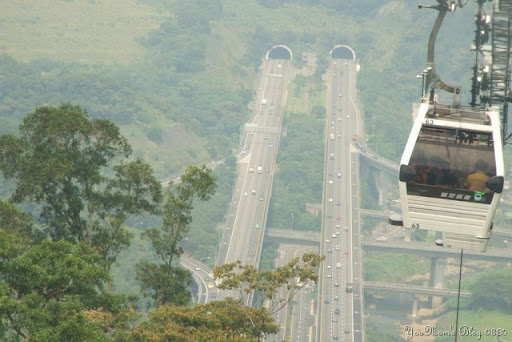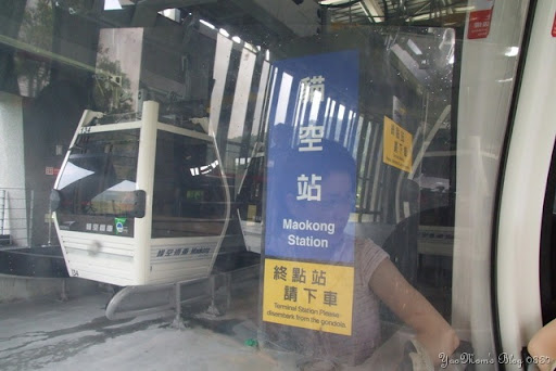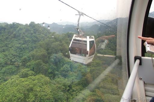 纜車還滿舒適的,一車可坐8人,高度不算高,但是足以飽覽貓空綠林景色,中間有一段路程用來觀賞夜景肯定很棒,是情人約會的好去處喔!堯弟坐上纜車一點也不怕高,還用手不斷拍擊玻璃門,對飲料罐比對外面風景有興趣,我們在纜車上不斷拍照,像是城市鄉巴佬般,不管啦,因為我要寫blog啊,需要東拍西拍。