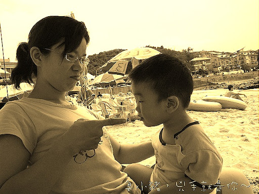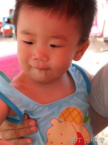 要尿尿也不跟媽咪說一聲,等我感覺到一陣溼熱的時候,已經來不及了。為了讓堯弟與沙灘做第一次接觸,老早就幫堯弟換了可愛維尼泳衣,就在坐下準備玩沙之際,阿弟冷不防尿了出來,我的天ㄚ,我的衣褲都是尿騷味,很好,帶著這陣味道玩水玩沙吧!