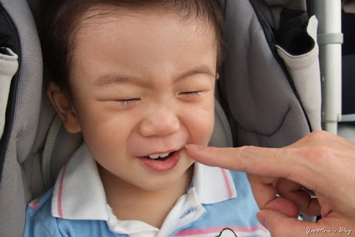 填飽肚子,來拍張照吧!堯弟臉臭臭,想要下去玩,可是媽咪要先拍照呀~乖乖乖,不哭,不哭。來,笑一個。