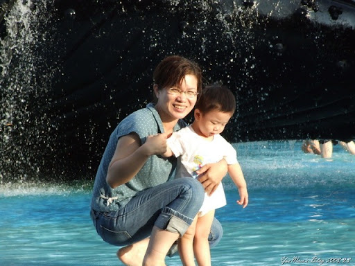 在海生館,堯弟最喜歡的就是這一座戲水池了,因為有好多小朋友在玩水,他一看到就非常興奮,想去找小朋友玩,堯媽立刻捲起褲管帶堯弟戲水去啦,堯爸顧家當兼當攝影師,捕捉我們母子的戲水照,呵,太陽快下山了,餘暉打在我們臉上,自然最美。